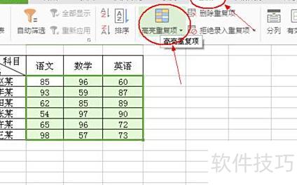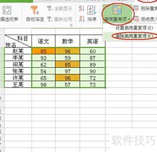 若要取消,依次点击菜单栏的数据,选择常用工具栏中的高亮重复项,再点击消除高亮重复项,操作所示。