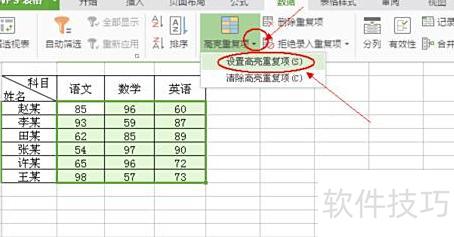 点击菜单栏数据,在常用工具栏中找到高亮重复项右下角的小三角,点击后选择设置高亮重复项,操作所示。