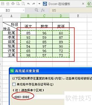 弹出高亮显示重复值对话框后,系统自动选中区域,直接点击确定即可。