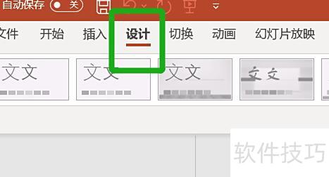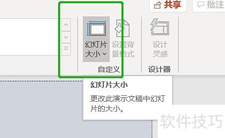 在界面顶部找到设计选项,其下方会显示一系列设计相关内容,选择其中的幻灯片大小选项即可。