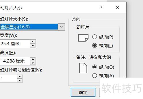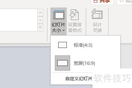 点击幻灯片大小选项,下拉菜单中可选标准(4:3)或宽屏(16:9),也可自定义尺寸,此处选择宽屏(16:9)。