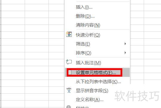 5. 右键点击,从弹出菜单中选择设置单元格格式,中红框所示。
