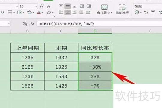 在表格中分别录入上年与本年的数据,选中同比增长率所在单元格,输入公式=TEXT((C15-B15)/B15,0%),其中引用的单元格需根据实际数据位置调整。公式末尾的0%表示结果以百分比形式显示,保留整数位,自动添加百分号呈现增长比率。
