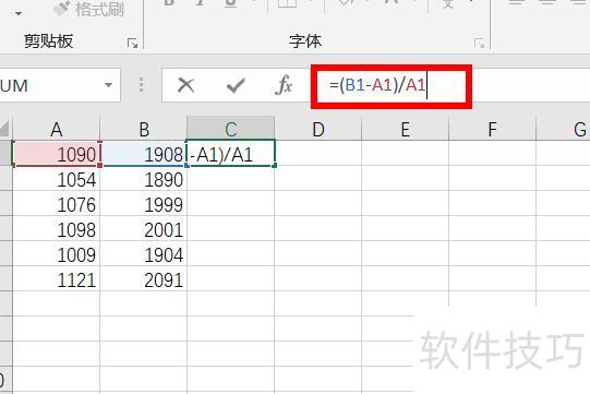 在fx后的输入框中输入=(B1-A1)/A1,如红框标注所示。