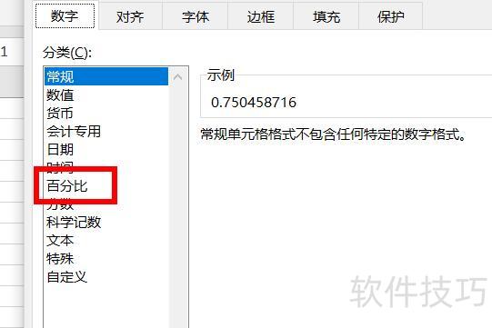 弹出单元格格式窗口后,点击数字菜单中的百分比选项,中红框所示。