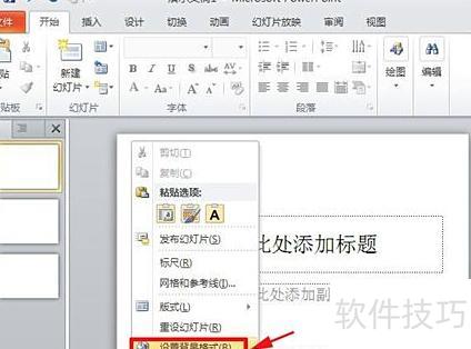 在PPT文档中,右键点击幻灯片空白区域,选择设置背景格式;或切换至设计选项卡,点击背景样式中的设置背景格式即可完成操作。