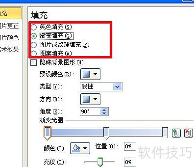 在设置背景格式窗口左侧选择填充选项,可看到纯色填充、渐变填充、图片或纹理填充和图案填充四种模式。用户不仅可为PPT幻灯片添加自定义图片作为背景,还能将背景设置为单一颜色或渐变色彩,满足多样化的设计需求。
