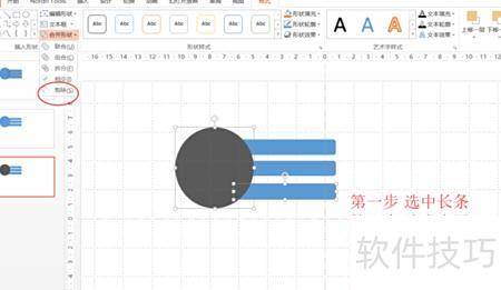 先选中第一个长条,再选中上方的大圆,点击格式中的合并形状并选择剪除;接着对第二个长条重复相同操作:选中长条与大圆,执行剪除;最后对第三个长条同样处理,依次选中并与顶层大圆进行剪除操作,完成三部分的图形合并。