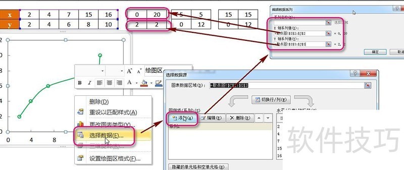 添加数据系列,按图示操作插入y=2的辅助水平线,依此方法添加其余直线。