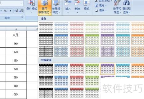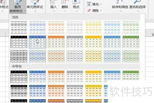 3、选择表格样式:点击样式组中的套用表格格式,从弹出的菜单中选取所需样式,表格将自动应用所选格式。