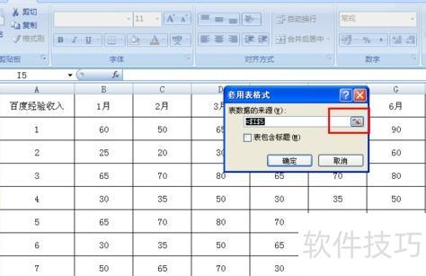 单击后弹出对话框,选择需套用格式的表格区域,点击红色框内按钮可选定相应范围。