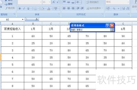 选定区域后,点击套用表格格式按钮,弹出设置框并进行相应配置。