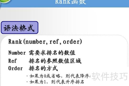 RANK函数语法为:RANK(排序值,范围,方式)。方式为0或省略时降序排列,为1时升序排列。