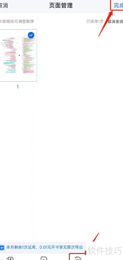 添加文件后,在底部编辑栏点击按钮调整方向,完成后点击即可保存已旋转的文档。