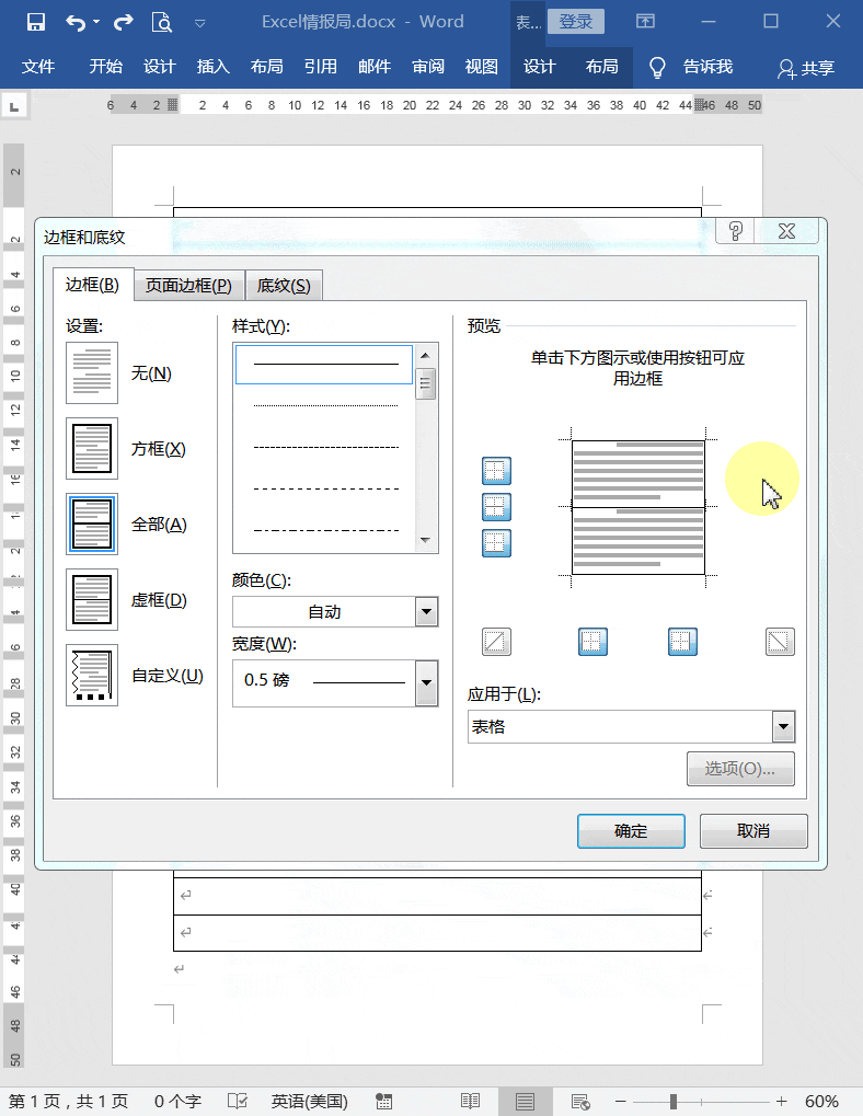 点击表格左上角的十字箭头全选表格,进入表格工具下的设计选项卡,点击边框区域右下角的斜向箭头,弹出边框和底纹对话框。