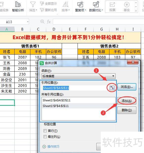 将销售表格1和销售表格2的数据区域依次选为引用位置,并添加至所有引用位置列表中。