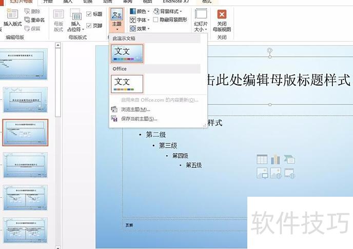 以插入幻灯片版式为例,点击左上角插入幻灯片母版按钮添加母版,若需退出,点击工具栏上的关闭按钮即可。