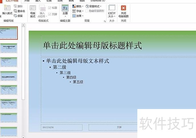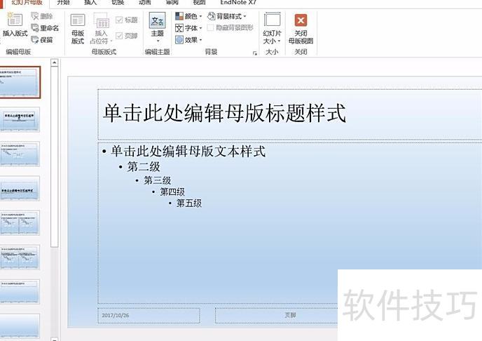 进入幻灯片母版界面后,上方显示各项属性选项,可逐一进行设置与调整。