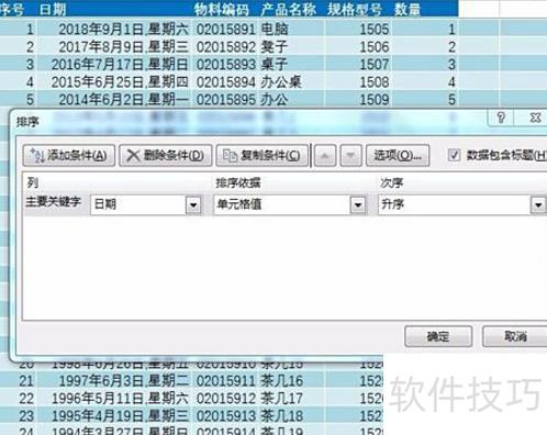 五、点击排序,在弹出窗口中选择日期列升序排列,确认设置。