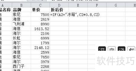 选中D2单元格,在fx栏输入公式:=IF(A2=冰箱,C2*0.8,C2),按回车确认。
