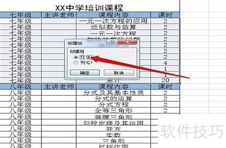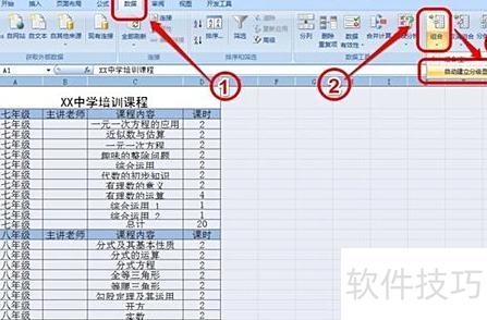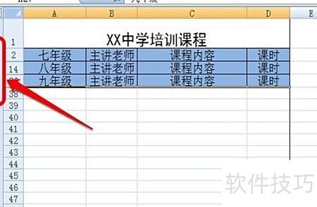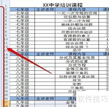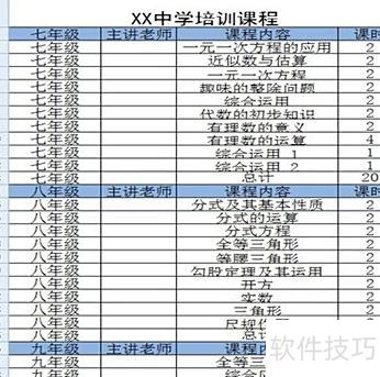 打开表格后,其中包含七、八、九三个年级的培训课程。若希望每次仅查看某一年级的课程,应如何操作设置?