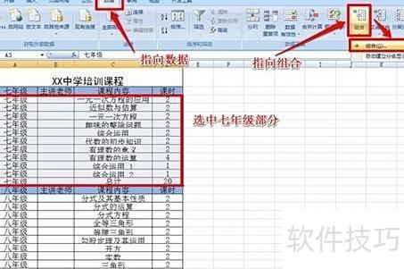 选中七年级部分内容,依次点击数据、组合、组合进行操作。