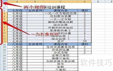 此时表格左侧会显示1、2两个视图按钮。点击1可折叠七年级内容,点击2则展开全部信息。此外,七年级条目前方还设有独立的折叠按钮,同样可实现内容的收起操作,方便用户灵活查看与管理信息。