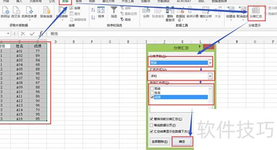 点击数据选项卡,选择分级功能组中的分类汇总按钮。