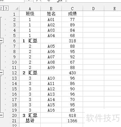 7. 这样已经很快了吗?其实还有更便捷的方法。由于表格中已包含sum求和公式(如各年级下方的总计行),可直接选择数据→组合→自动创建分级显示,系统将自动完成分级效果,操作更高效,结果与手动设置一致,省时省力,适合处理结构清晰的汇总数据表。