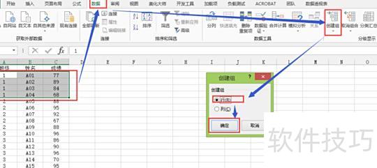 在弹出的创建组对话框中选择行,点击确定完成创建。