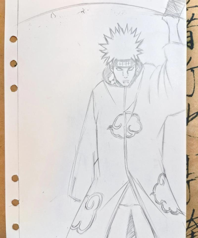 3、处理身体与服饰细节接下来画身体,肩膀要平,显出威严,黑袍的领子要立起来,这是晓组织的特色,画袍子时,注意褶皱,要随着身体动作变化,比如手臂抬起时,袖子会有堆积,腰部的束带要画清楚,别忘了手指,佩恩结印的手势很帅,可以重点刻画,鞋子比较简单,是普通的忍者鞋,但也要画出立体感。