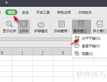 此时可任意选择一个工作表,在菜单栏中点击视图下的重排窗口,然后从下拉选项中选择水平平铺。