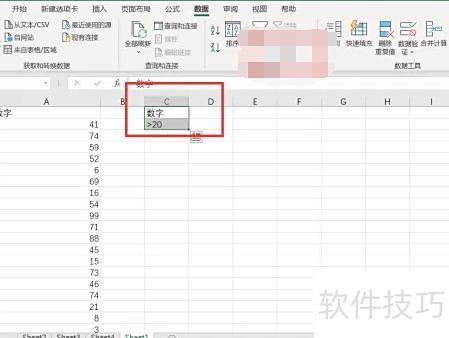 在Excel表格右侧空白单元格输入条件,用于提取左侧数据列中大于20的数值。