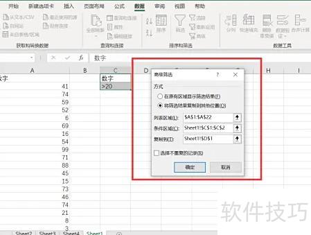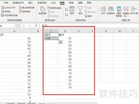 点击确定,将左侧数据列中大于20的数值提取并放置到指定位置。