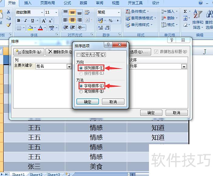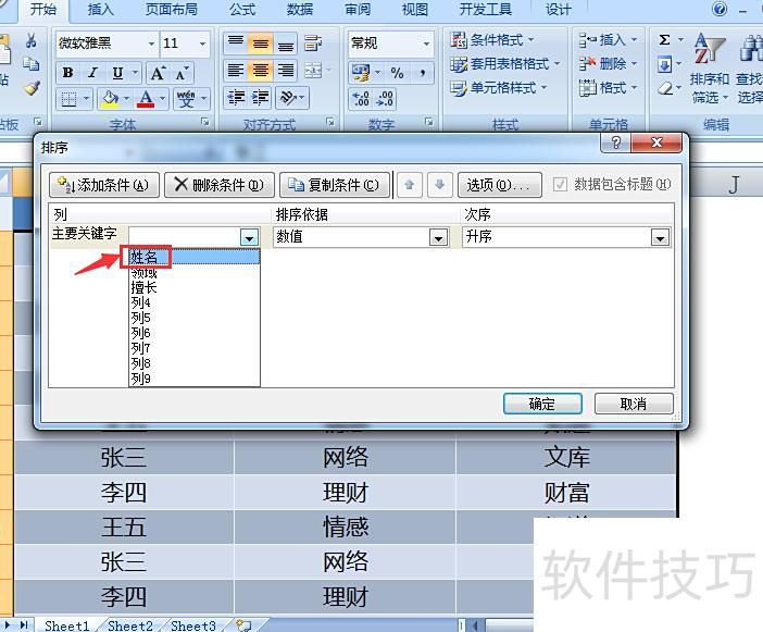 弹出排序窗口后,在主要关键字中选择姓名,其余选项保持默认设置即可。