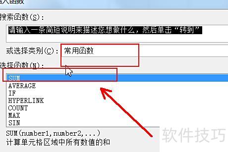 插入函数后,在弹出窗口中选择常用函数,点击确定即可。