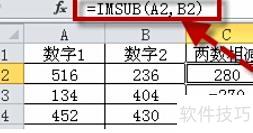 所示:用数字1减去数字2,C2单元格输入公式=IMSUB(A2,B2),按回车确认。然后选中C2单元格,将鼠标移至其右下角,待光标变为黑色十字后,按住左键向下拖动填充,即可实现公式的快速复制。