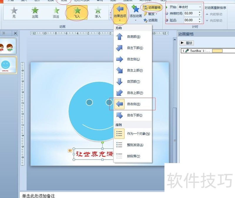 新建或打开PPT文件,插入文本框并输入文字。选中文字后,切换到动画选项卡,点击动画窗格,选择飞入动画效果。点击效果选项,设置方向为自右侧,调整动画持续时间为2秒,完成动画参数设定。