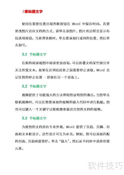 在Word文档中编辑内容,红色文字表示章标题(一级标题),绿色文字表示节标题(二级标题)。