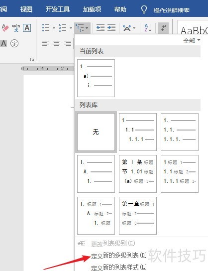 接下来需设置自动编号。将光标放在一级标题(红色文字)中,点击多级列表中的定义新的多级列表选项,开始为一级标题配置自动编号功能。