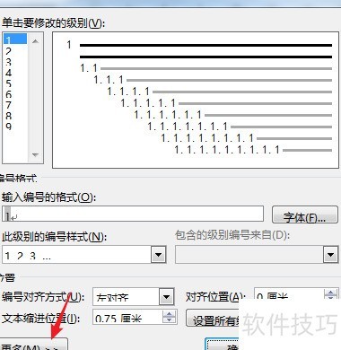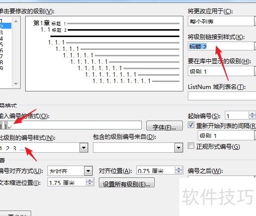 同理,将光标放在绿色文字上,为其二级标题(节标题)设置多级列表,并在链接到样式中选择标题2。由于一级列表编号样式已设为1,二级编号将自动显示为1.1。