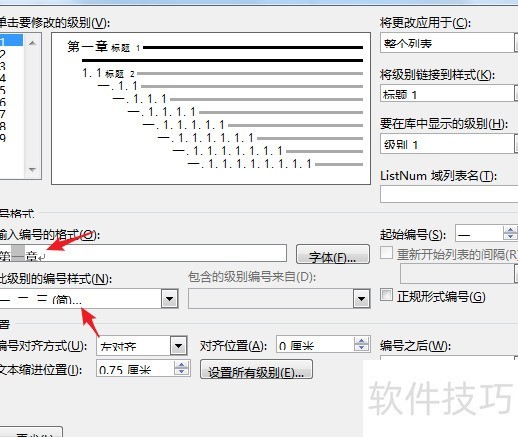 若需采用第一章、1.1、1.2;第二章、2.1、2.2这类编号格式,在设置第一级编号时应选择一、二、三样式,并在一前后分别添加第和章字,形成第一章的格式,具体操作所示。