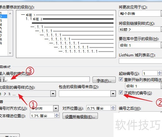 设置第二级列表时,需在①处选择1、2、3编号样式,并勾选②处的,方可呈现如③所示的编号效果。