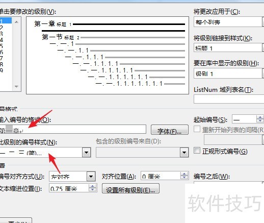 与前述两种自动编号类似,第一章、第一节,第二章、第二节这种样式也常被使用。同理,第一级编号的设置方法与之前所述相同。
