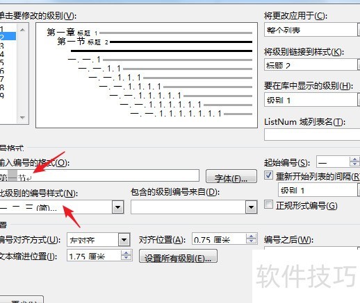 第二级自动编号的设置有所不同。在编号样式中仍选择一、二、三格式,但在栏中,需手动删除第一级的一,仅保留第二级的一,并添加第和节字,形成如第一节的格式,具体效果所示。