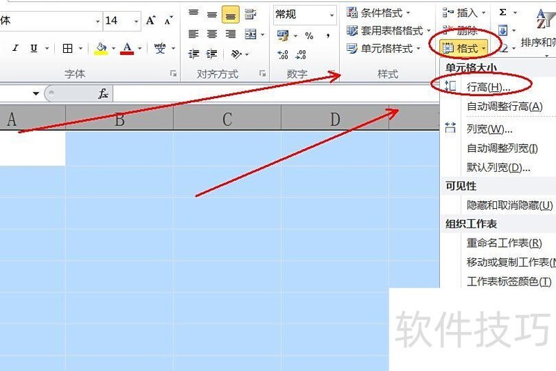 按Ctrl+A全选表格,进入开始选项卡,点击格式中的行高进行设置。