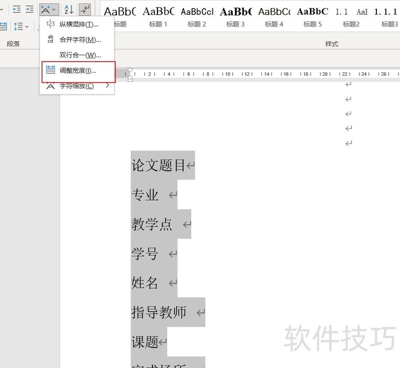 选中需对齐的文字,点击开始中的符号,选择调整宽度即可。