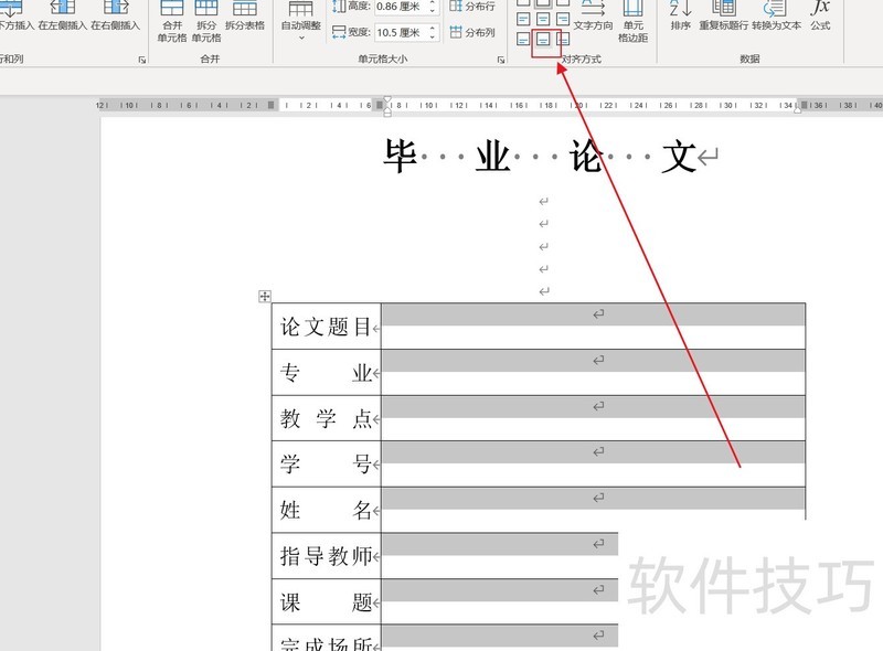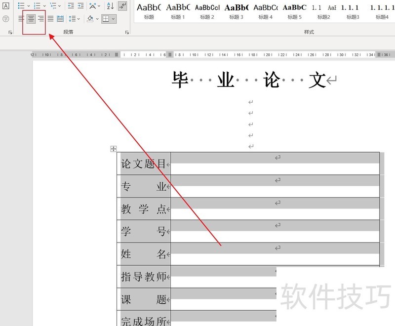 全选表格后点击居中按钮,使表格整体居中对齐。