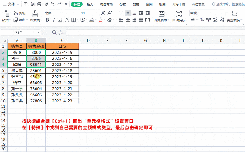 首先选中需转换的数据,按下快捷键打开单元格格式窗口,在类别中选择所需的金额格式类型,确认后即可完成设置,操作所示。