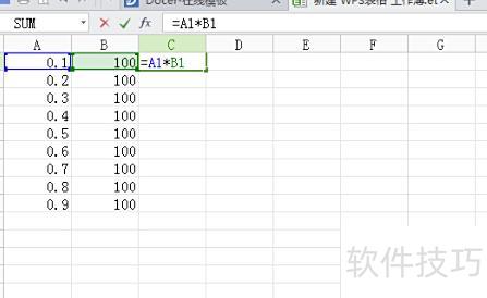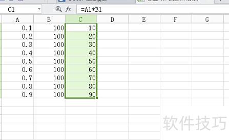 将C1单元格内容复制并粘贴到C2至C9区域,生成9组数据乘积。